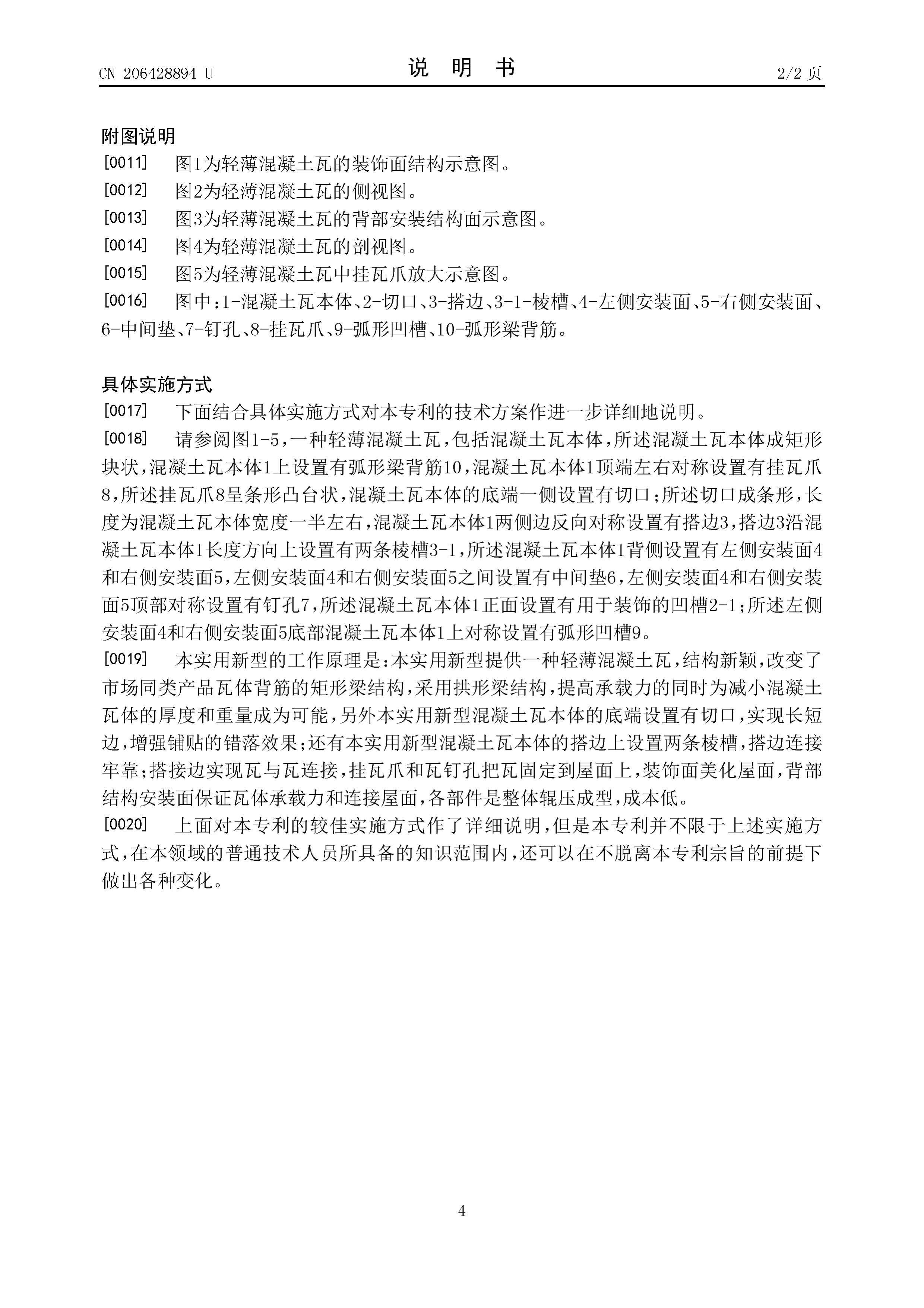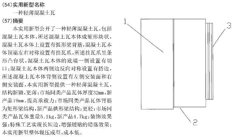 5.根據(jù)權(quán)利要求1所述的輕薄混凝土瓦,其特征在于,所述左側(cè)安裝面和右側(cè)安裝面底部混凝土瓦本體上對稱設(shè)置有弧形凹槽。